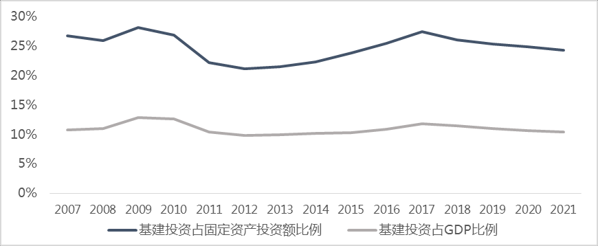 圖2:我國基建投資占固定資產(chǎn)投資、GDP比例測算